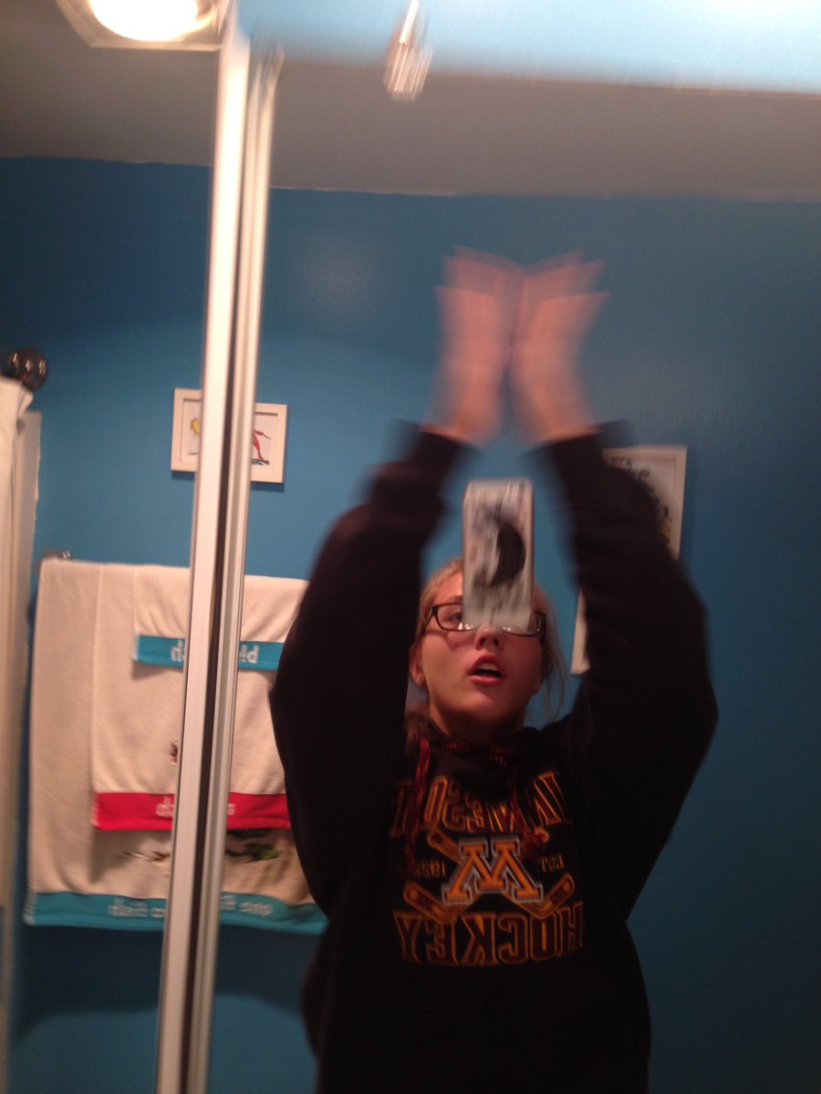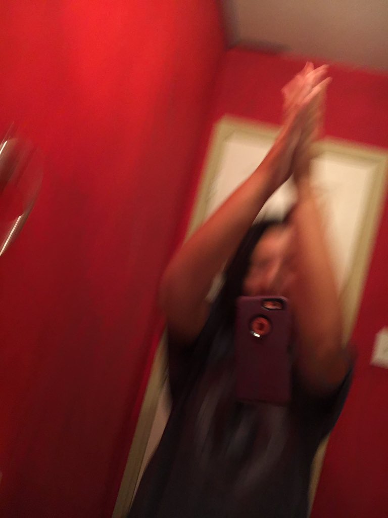 Ia mencoba mengambil foto dengan handphone-nya sementara dirinya menepuk kedua tangannya.